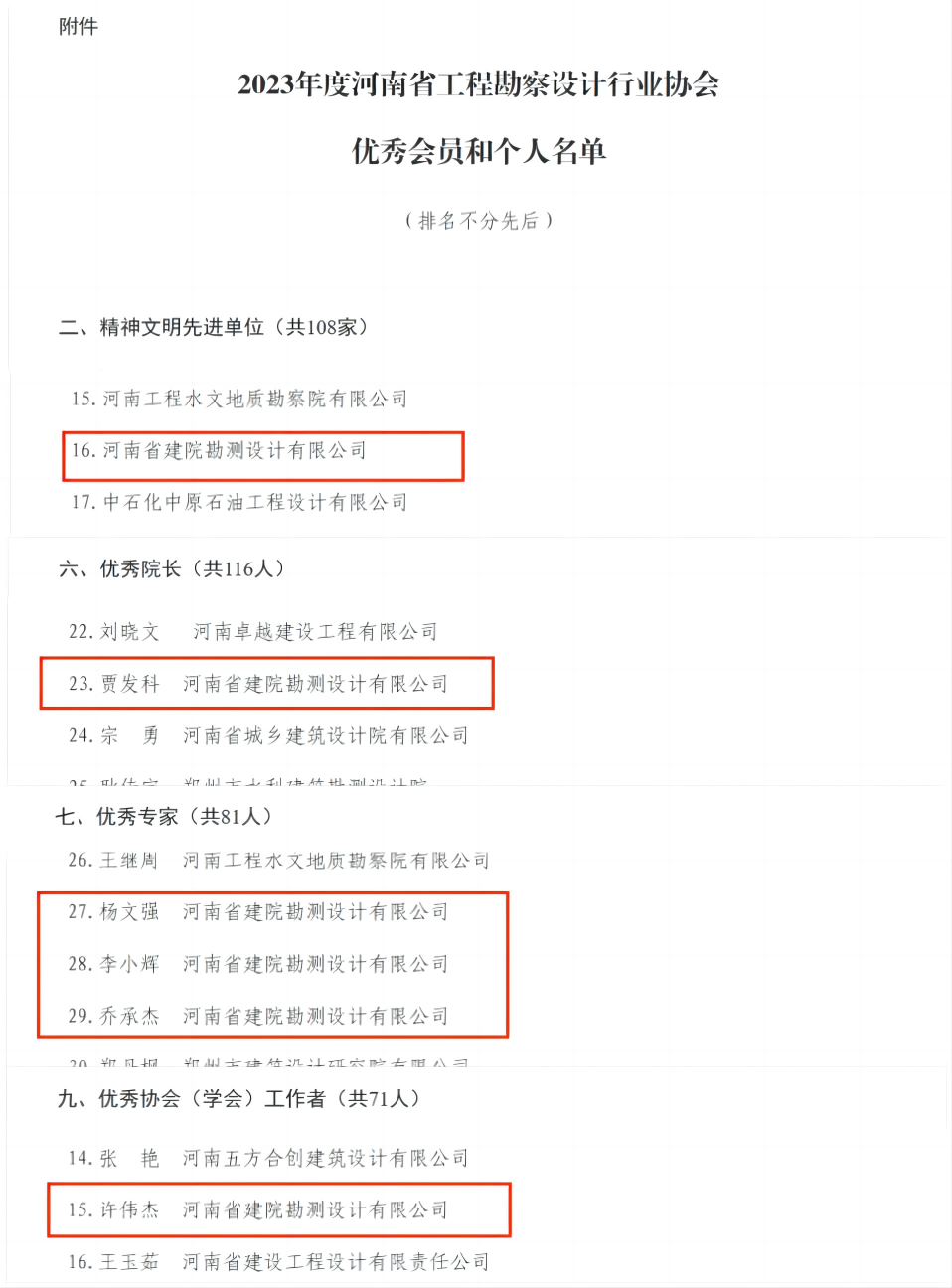 近日,河南省工程勘察设计行业协会公布“2023年度河南省工程勘察设计行业协会优秀会员和个人名单”。勘测公司荣获“2023年度精神文明先进单位”荣誉称号;副总经理贾发科同志荣获“2023年度优秀院长”荣誉称号;副总经理杨文强同志、岩土设计专业总工程师乔承杰同志及勘察一分院技术负责人李小辉同志均荣获“2023年度优秀专家”荣誉称号;质量安全管理部主任许伟杰同志荣获“2023年度优秀协会工作者”荣誉称号。
