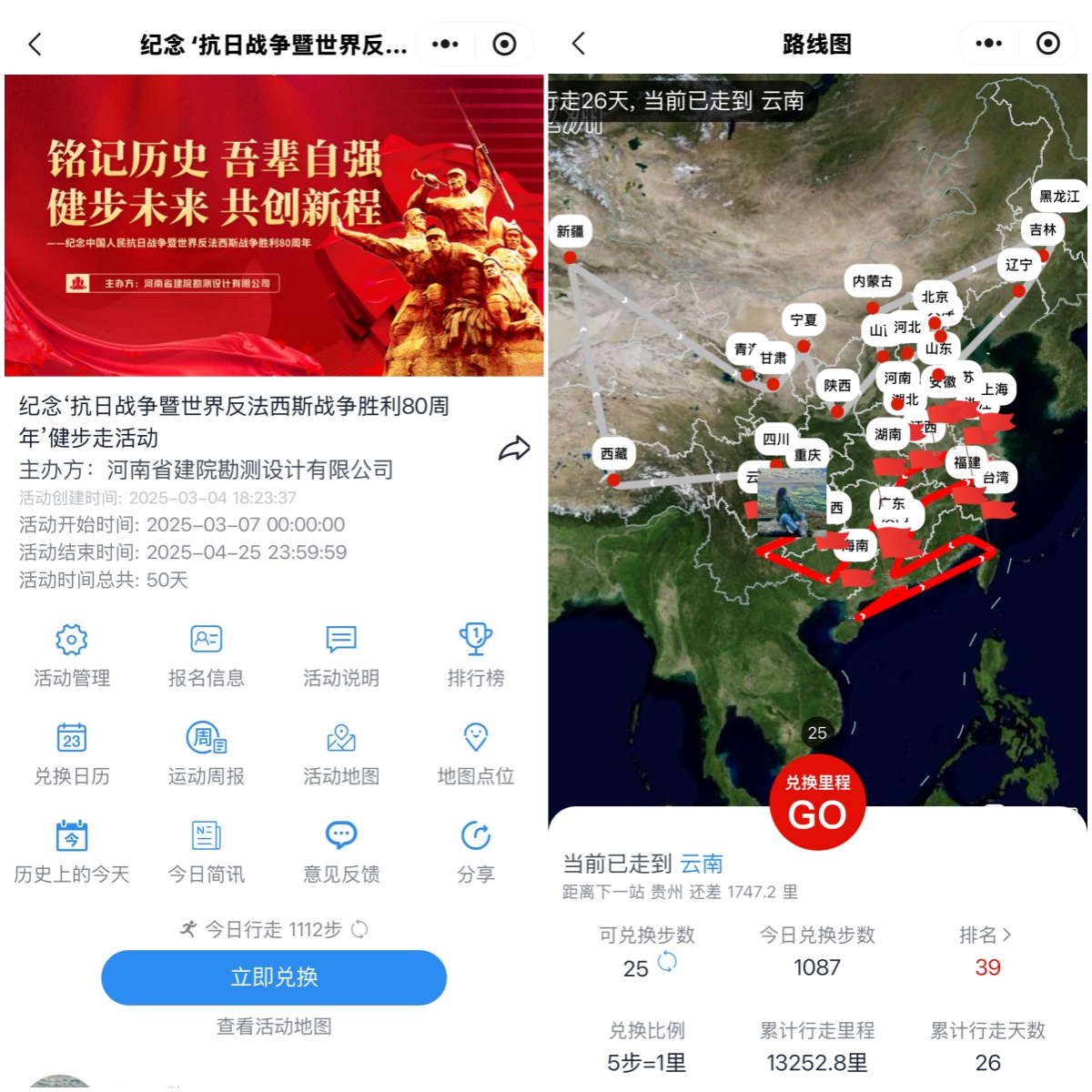 活动过程中,参与人员可通过健步走小程序将每日所走步数兑换为程序地图中的公里数(每5步可兑换为地图中的1里);地图全程100000里,途经全国34个省会城市,平均每天走路10000步,可到达终点站——北京。